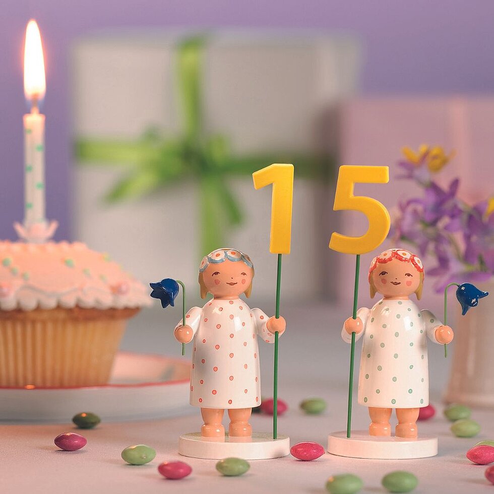 Decked out in their spotted dresses, the Number Girls turn the birthday table into a true celebration. Children are especially fond of the Number Girls – they become lifelong companions who bring back wonderful memories on their birthday. Each girl is given a set of numbers from 0 to 9. Years one to nine all feature one girl, from the tenth birthday onward, she is joined by a second charming maiden.